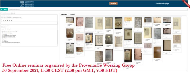 The CERL Provenance Digital Archive has been created in the Arkyves environment. After logging in, using your FB, Google or Orcid accounts, you may store your digital images of provenance evidence in the CERL PDA. The images and the descriptions you create are published under a CC0 license and the images are available as IIIF. You may access the Provenance Digital Archive here. |